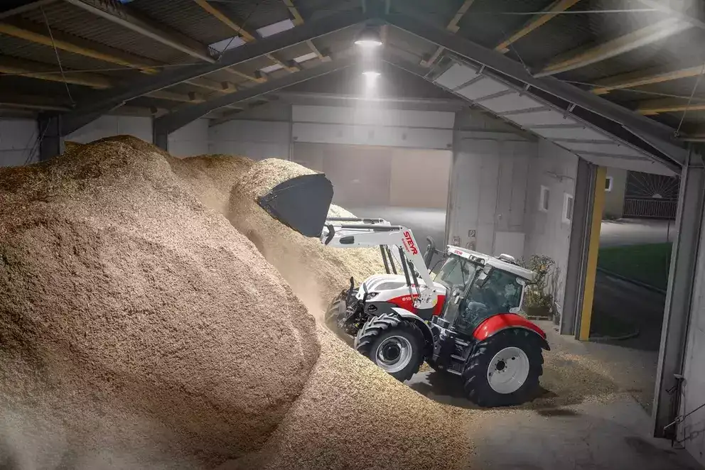 The STEYR PROFI CLASSIC is all geared up for loader work and can be ordered loader-ready. With its axial piston hydraulic pump with variable displacement and the two optional electronic hydraulic valves, the PROFI CLASSIC is perfectly suited for use with a front loader. The control joystick is integrated in the armrest's right control console and allows precise handling while the high-visibility roof and the slim-line pillars ensure you can keep an eye on everything.